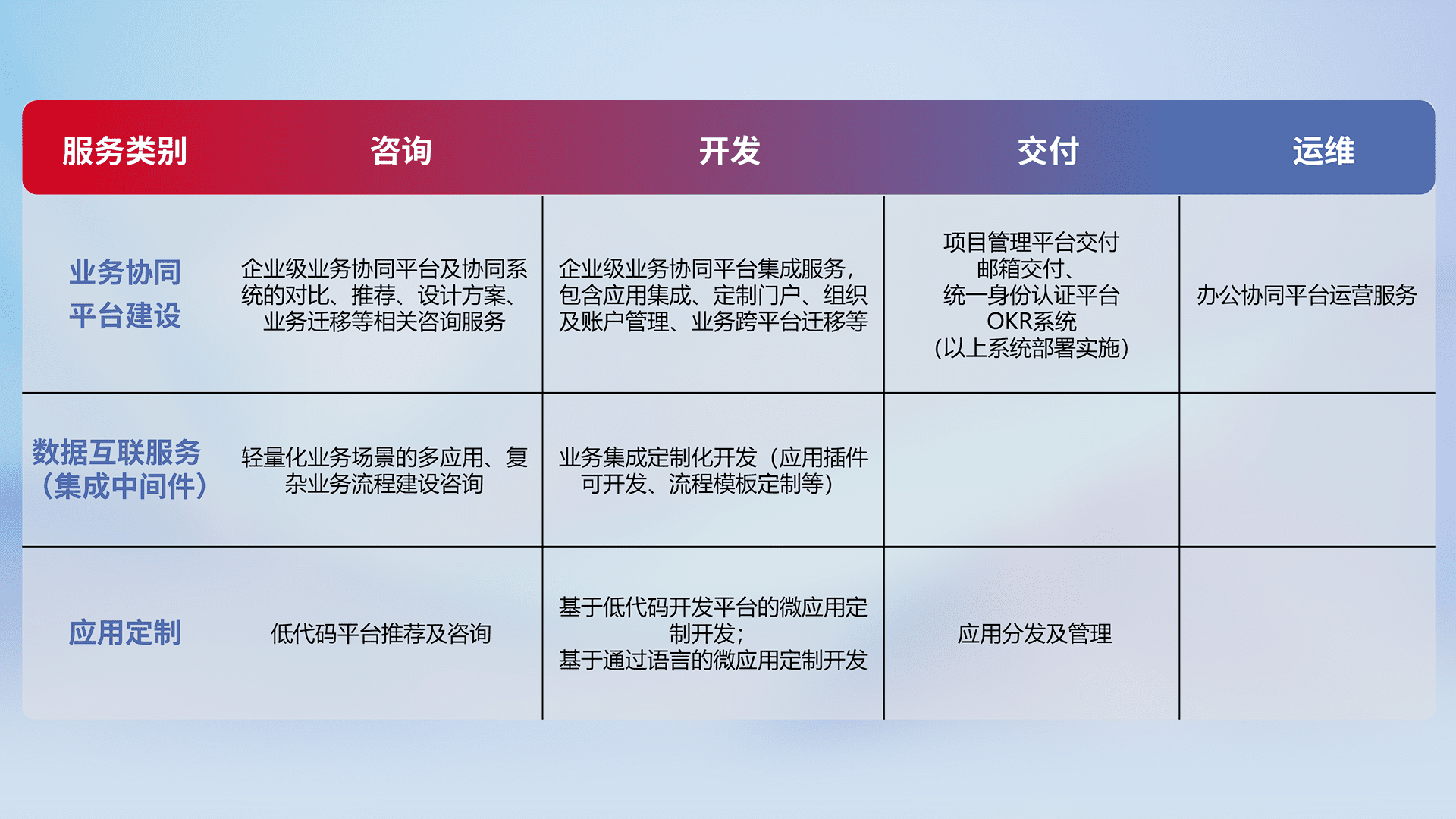 针对钉钉、、、企微、、、、IDaas等平台级产品提供产品的规划、、、方案、、交付、、、定制化开发等服务,,,实现如统一协同办公、、、、智能客户服务、、、混合会议管理、、、、智能数据查询、、、、等业务场景,,,,实现数字化转型。。