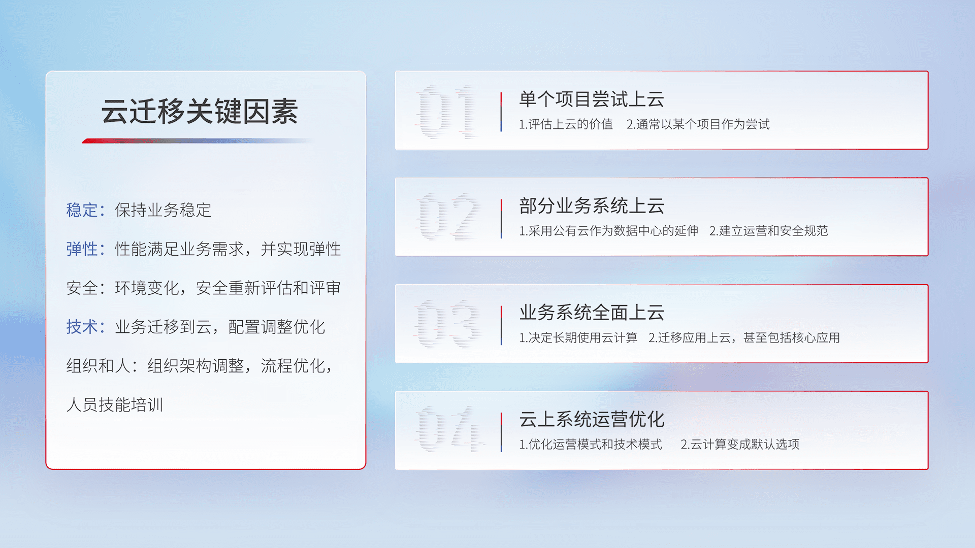 结合实际业务,,从规划设计、、、云平台选型、、云原生改造、、、数据迁移、、、集成交付,,迁移全过程为客户识别最佳上云路径,,,做好风险识别管理,,,设计网络架构、、、身份权限、、安全审计合规、、操作审计、、、日志审计、、、、监控告警策略、、、、多站点容灾设计等,,对云上基础设施进行整体规划,,,,提升IT治理水平,,以满足弹性、、、、高可用、、、高性能的需求。。。